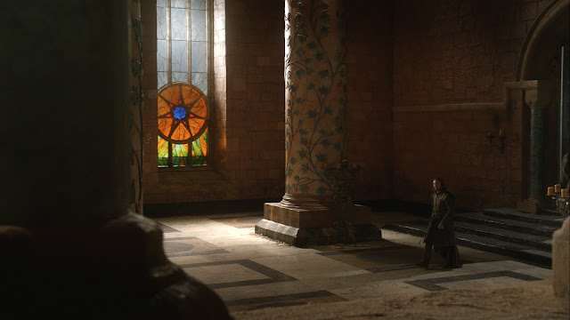 Ned Stark gives the guard a blank stare before taking off his gloves, the guard realizes Ned’s disinterest and the two begin walking to the council chamber. First they walk through the Great Hall, where the throne sits. Jaime Lannister is lingering in front of the throne.