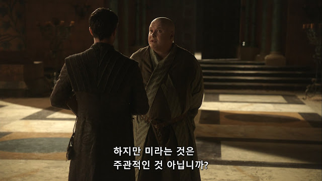 Varys enters the Throne Room, where Baelish is standing, looking at the throne.